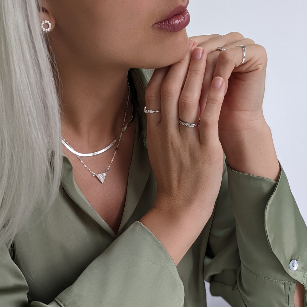 Elegantly sparkle with our Sterling Silver Cubic Zirconia Triangle Necklace, a geometric piece that exudes sophistication and style. This chic CZ triangle pendant is perfect for everyday wear and special occasions alike.