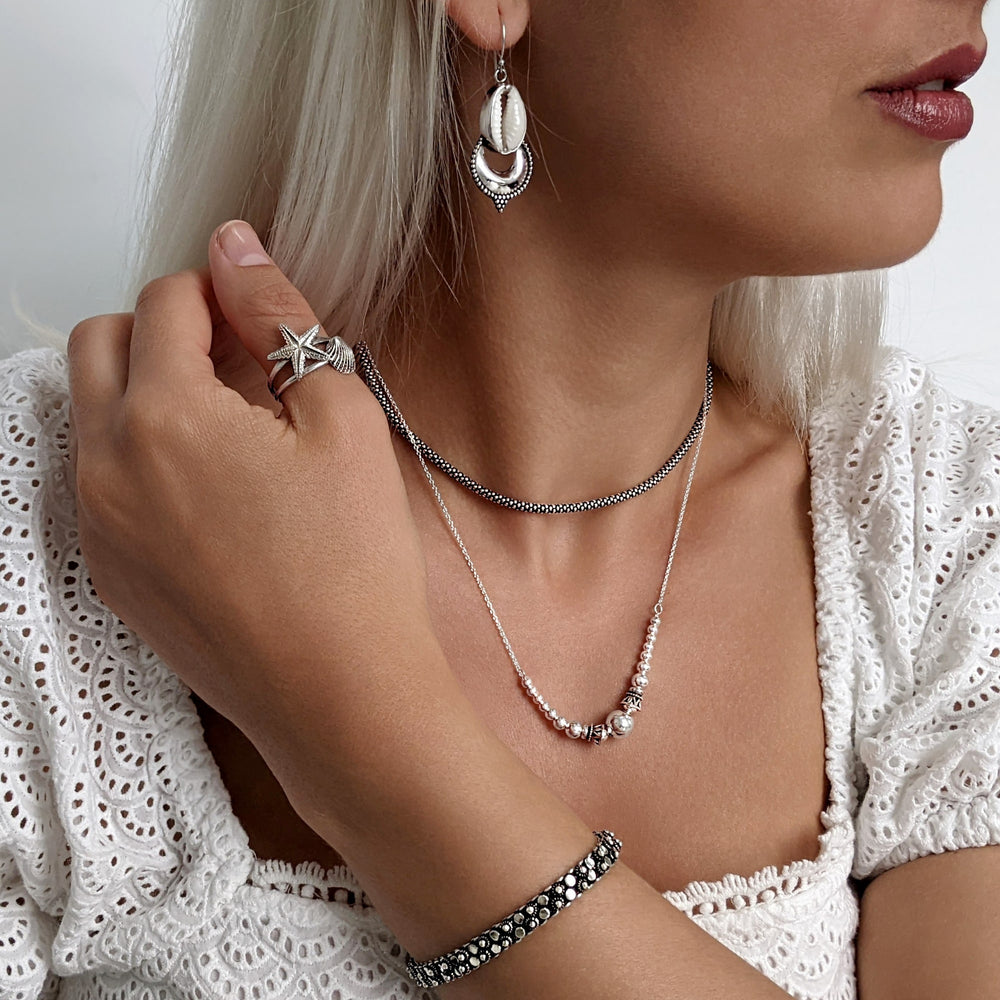 This striking oxidized sterling silver chainmail bracelet features two rows of intricately crafted daisy flower and circle beads, creating a richly detailed, textured design. The oxidised finish gives this piece a vintage, gothic-inspired look, reminiscent of treasured heirlooms. Graceful yet versatile, it carries an air of old-world magic€”perfect for adding a touch of romance and dark elegance to everyday moments. A must-have for those who appreciate unique, antique-style jewellery.