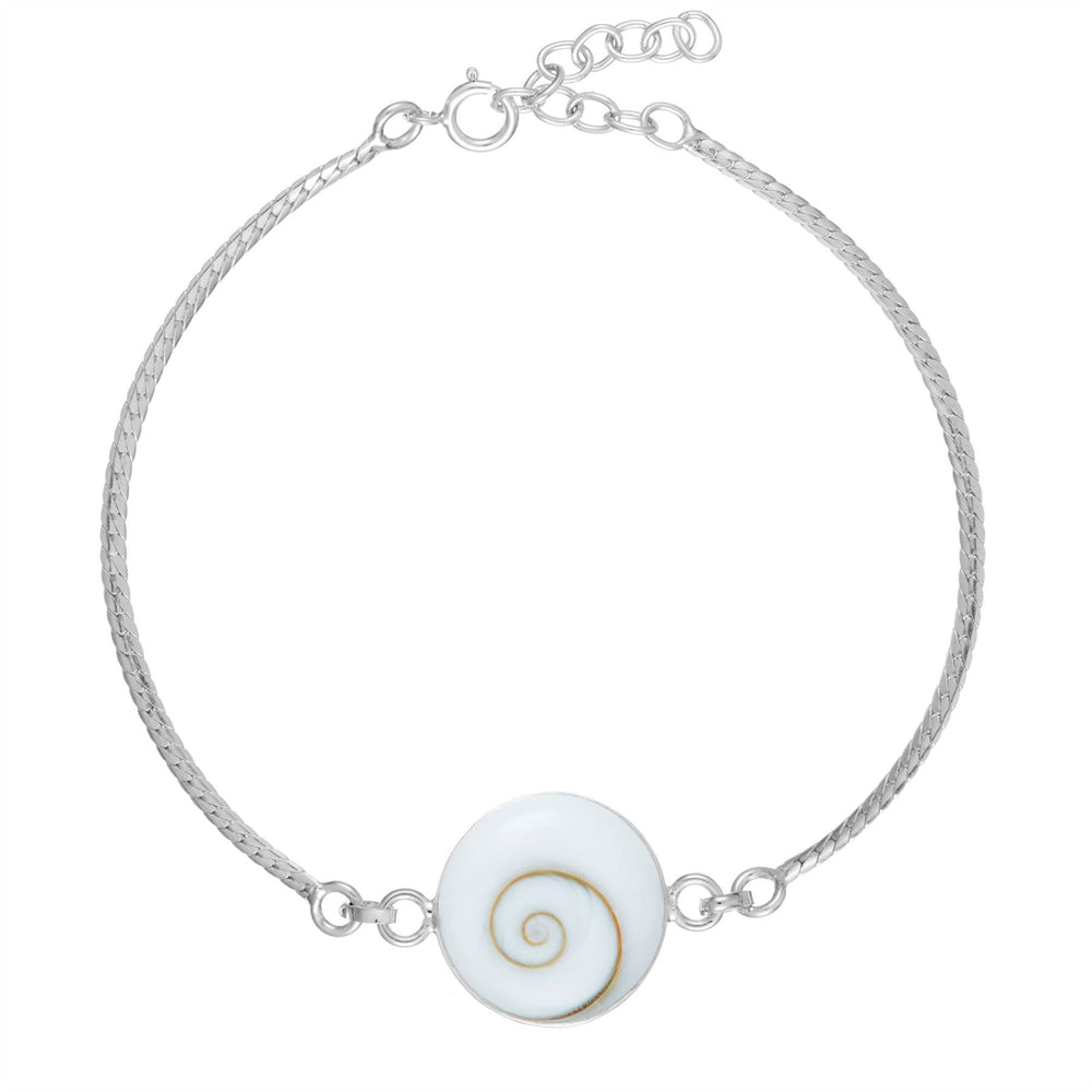 • 925 sterling silver herringbone chain bracelet featuring a round cut-out Flower of Life charm with a natural Shiva eye shell.