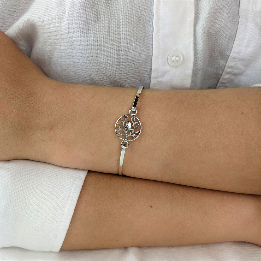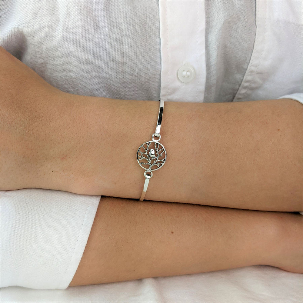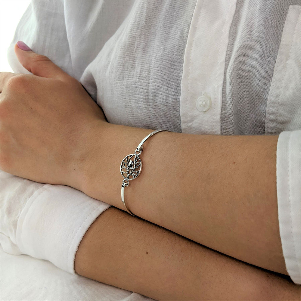 Experience nature's elegance with our Sterling Silver Thin Round Open Bird in Tree Bangle With a Hook Clasp, a unique piece that captures the delicate beauty of a bird amidst branches. Crafted with fine quality 925 silver, this bangle features an open design and a hook clasp, offering both contemporary style and timeless charm inspired by nature.