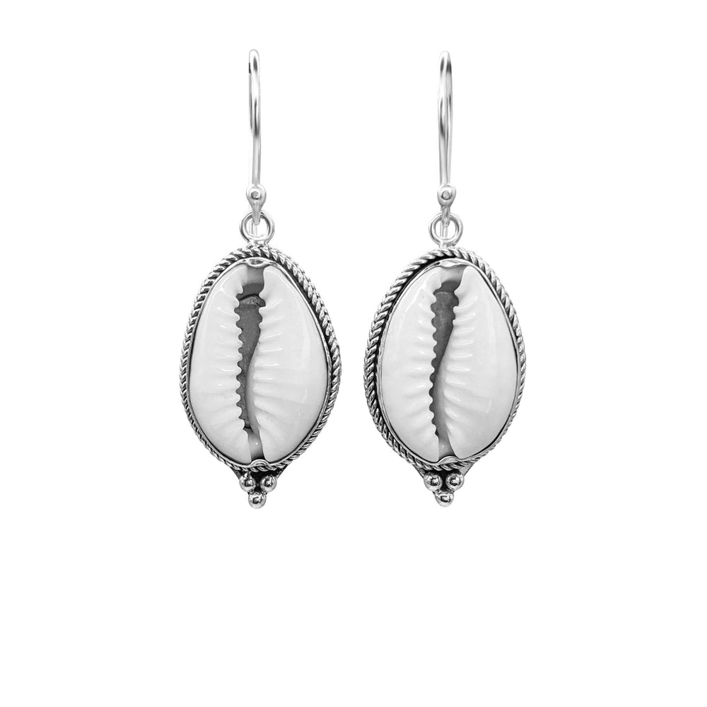 - 925 sterling silver drop earrings featuring a cowrie shell framed by delicate ropework detailing and finished with granulation at the bottom.