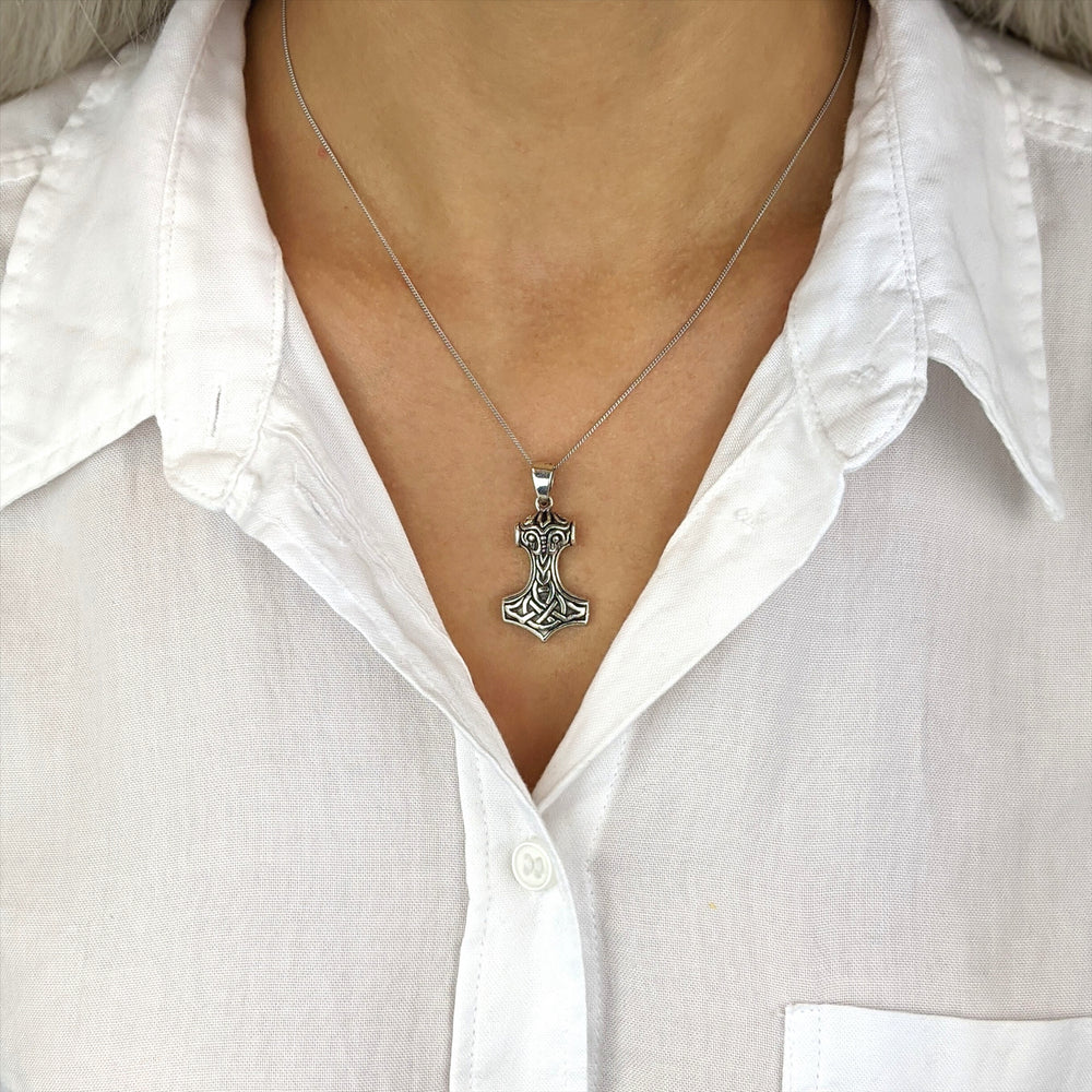 • 925 sterling silver Thor's Hammer pendant necklace featuring raised Celtic knotwork set against an oxidized background.