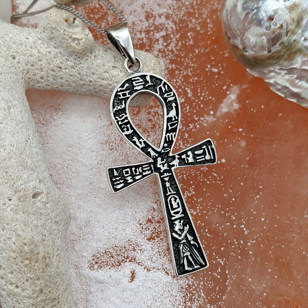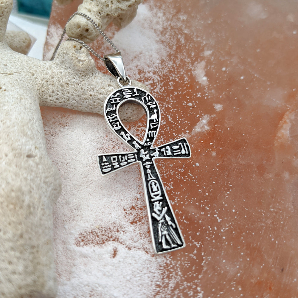 - 925 sterling silver ankh cross pendant necklace featuring raised hieroglyphic detailing set against an oxidised background, creating bold contrast and a striking ancient-Egyptian inspired design.