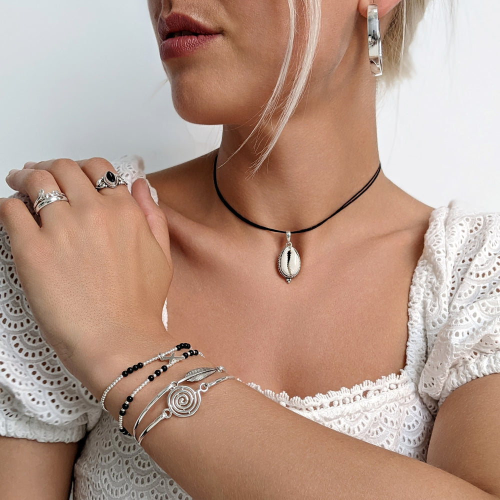 Channel boho chic with our Sterling Silver Rope Framed Cowrie Shell Boho Bali Pendant Necklace. This pendant necklace showcases a cowrie shell framed by a rope design, perfect for adding a touch of beach-inspired elegance to your look.